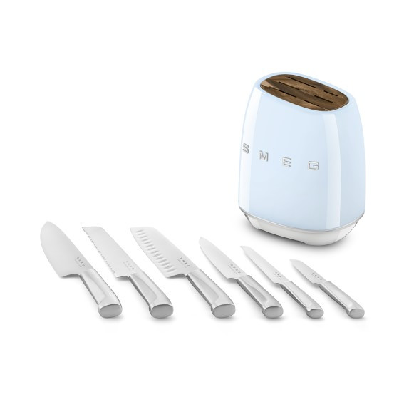 سرویس چاقو 7 پارچه اسمگ مدل SMEG KBSF01BL یک مجموعه زیبا و کارآمد برای آشپزخانه است. این سرویس شامل چاقوهای مختلفی برای برش انواع مواد غذایی است. تیغه های این چاقوها از فولاد ضد زنگ آلمانی ساخته شده اند. دسته های آنها نیز از استیل صیقلی و بادوام هستند.