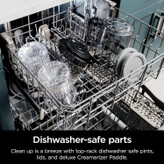 موارد شامل: پایه موتور با موتورهای دوگانه درایو، پدل کرمیزر لوکس، (2) 24 اونس. پینتهای لوکس CREAMi با دربهای ذخیرهسازی، کاسه بیرونی و درب در حین پردازش، و راهنمای الهامبخش دستور غذا.